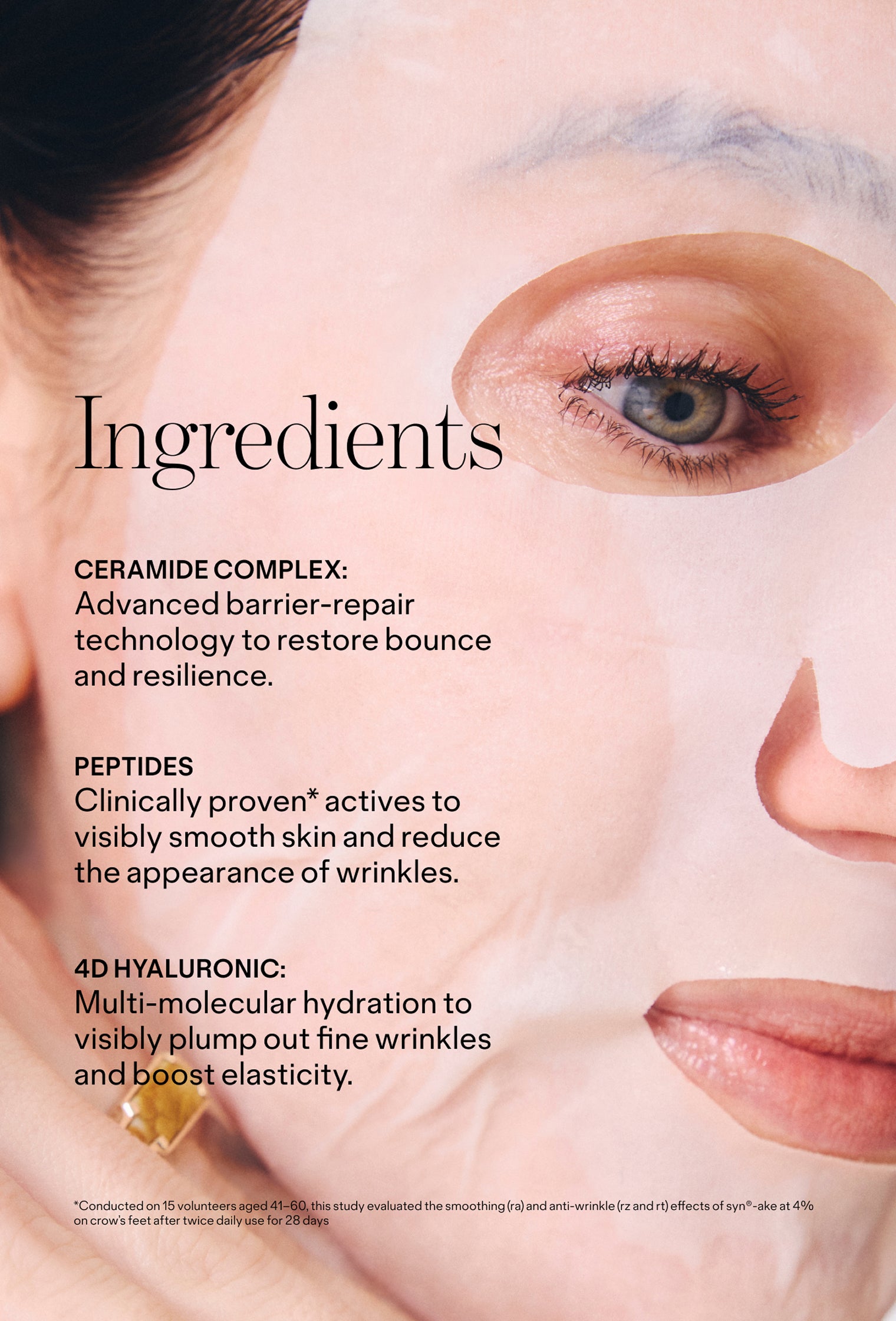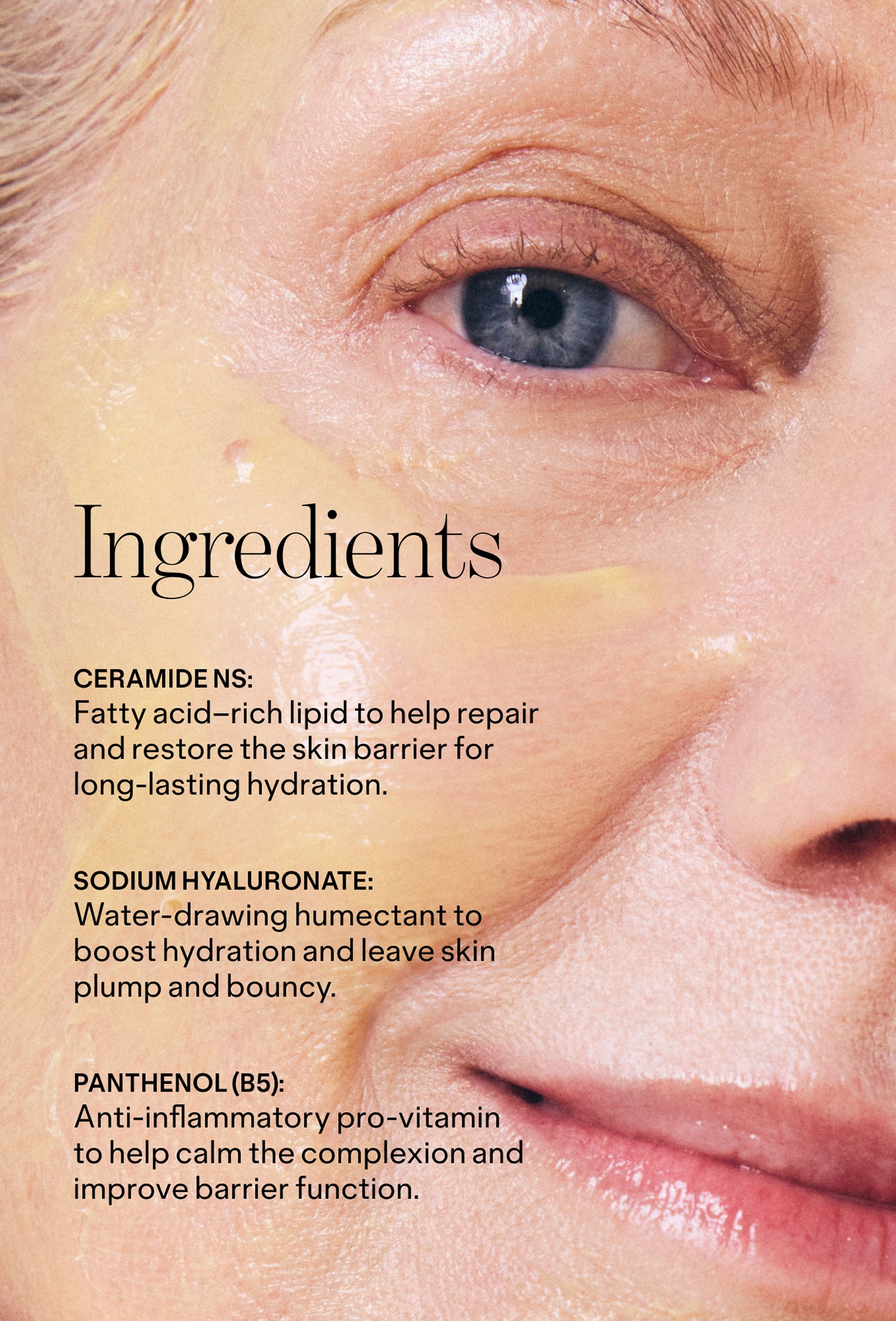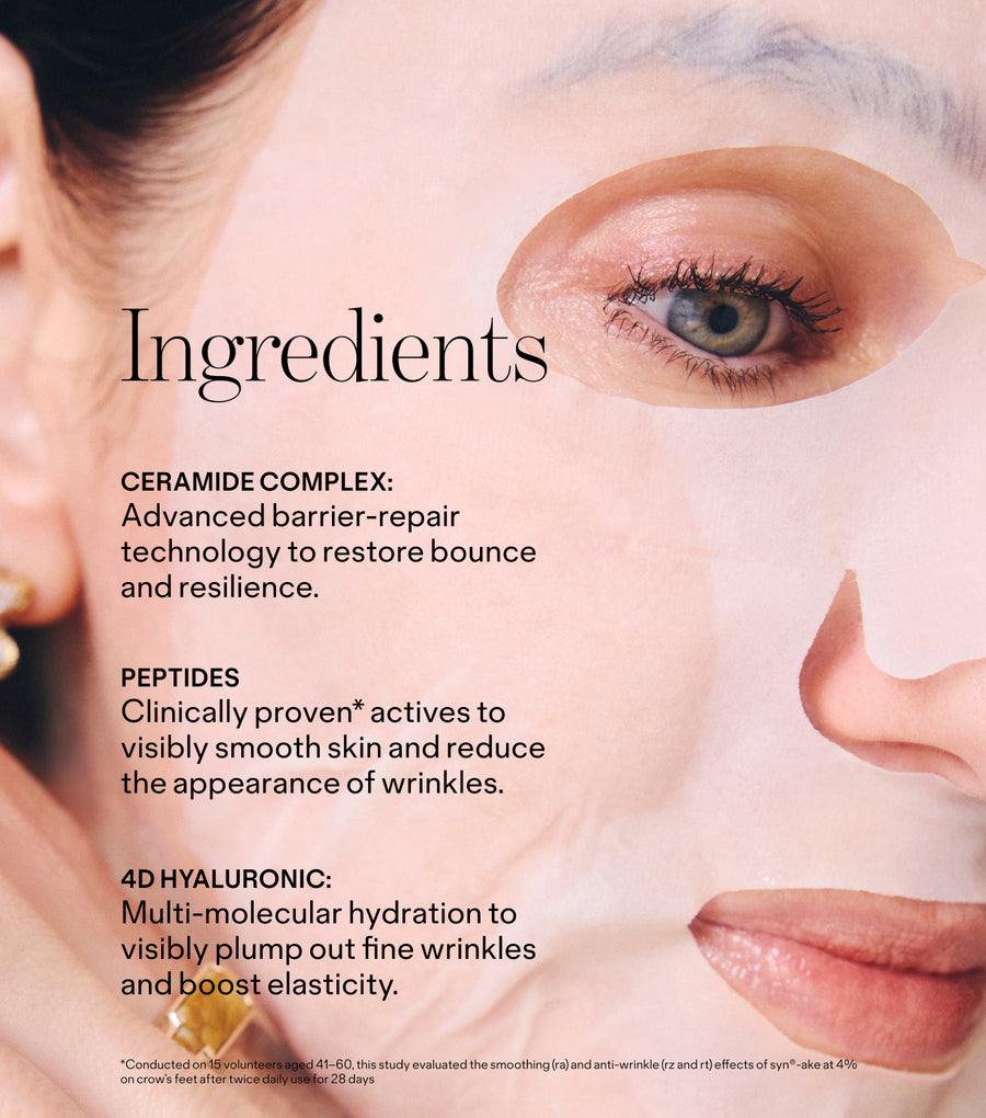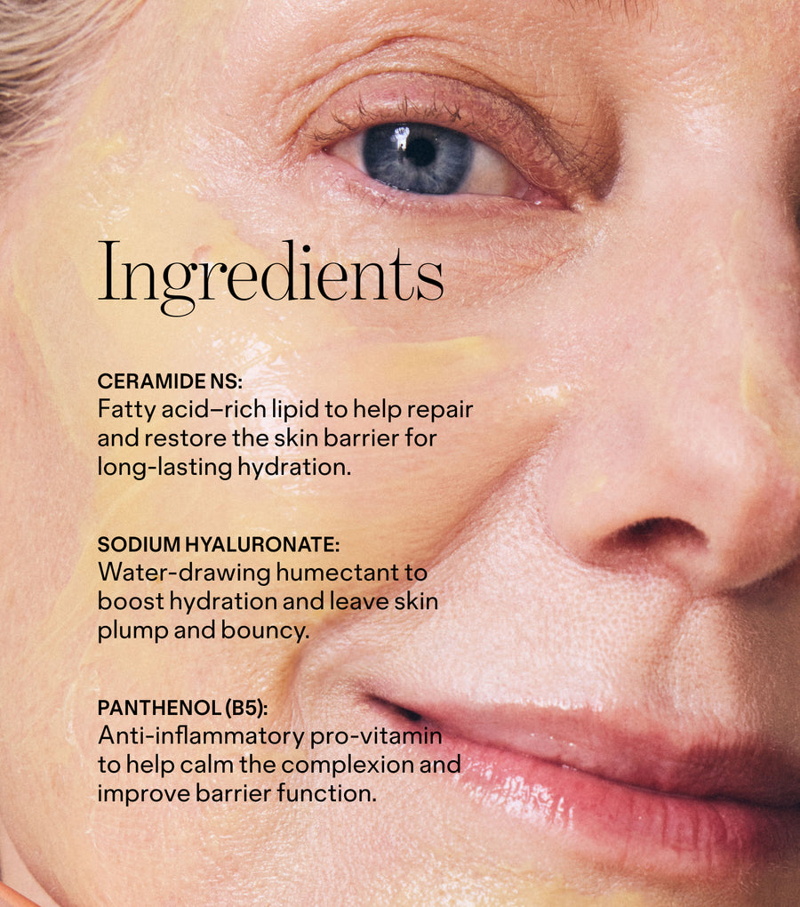This is your four-dose wondermask: Ceramides, peptides, 4D hyaluronic, and niacinamide drench skin for deep hydration and barrier-support with a plush, bouncy finish that helps skin look tighter and plumper instantly.